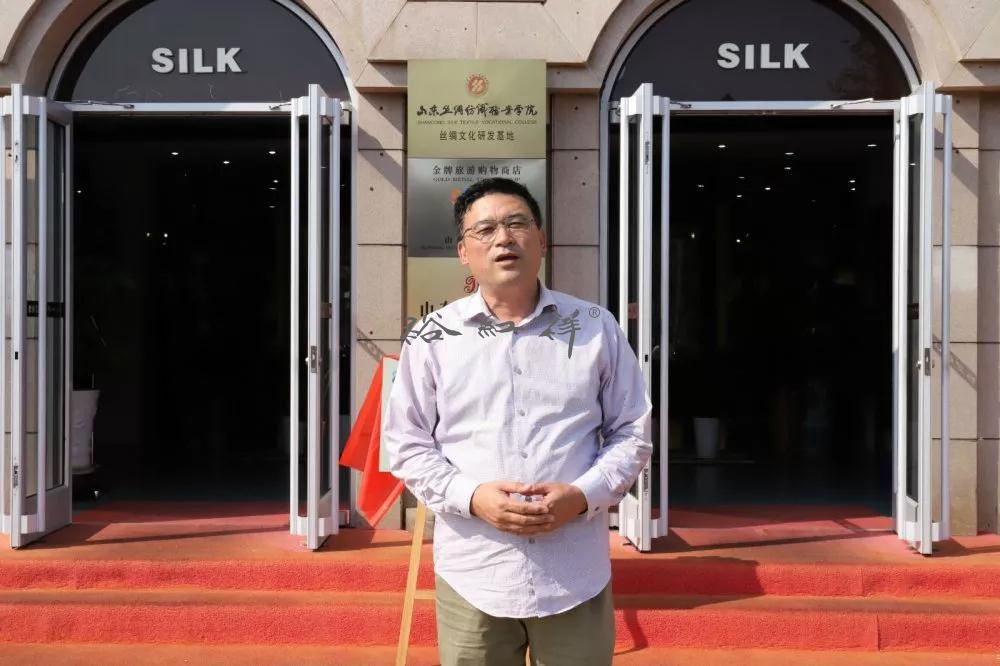 仪式中院长刘志刚提到,“一带一路”是2013年9月习总书记提出的国家合作倡议。“一带”就是丝绸之路经济带,“一路”就是21世纪海上丝绸之路。由此可见丝绸和丝绸之路在中国和世界的影响。丝绸是最有历史的中国代表性元素和商品,丝绸之路是最悠久的中国代表性文化。早在2000多年前的汉代,威海就有柞蚕养殖,所以才有“中国柞蚕在山东,山东柞蚕在威海”的说法。毕旭东馆长就是一位致力于传播威海丝绸文化的使者。他是我校聘请的非遗导师,是一位实业家,是威海蚕茧扩丝和柞绸草木染技艺的代表性传承人。他集中物质、经济、智慧、精力打造的胶东首屈一指的“裕红祥丝绸文化馆”,成为威海最有特色的专题文化展示场馆。