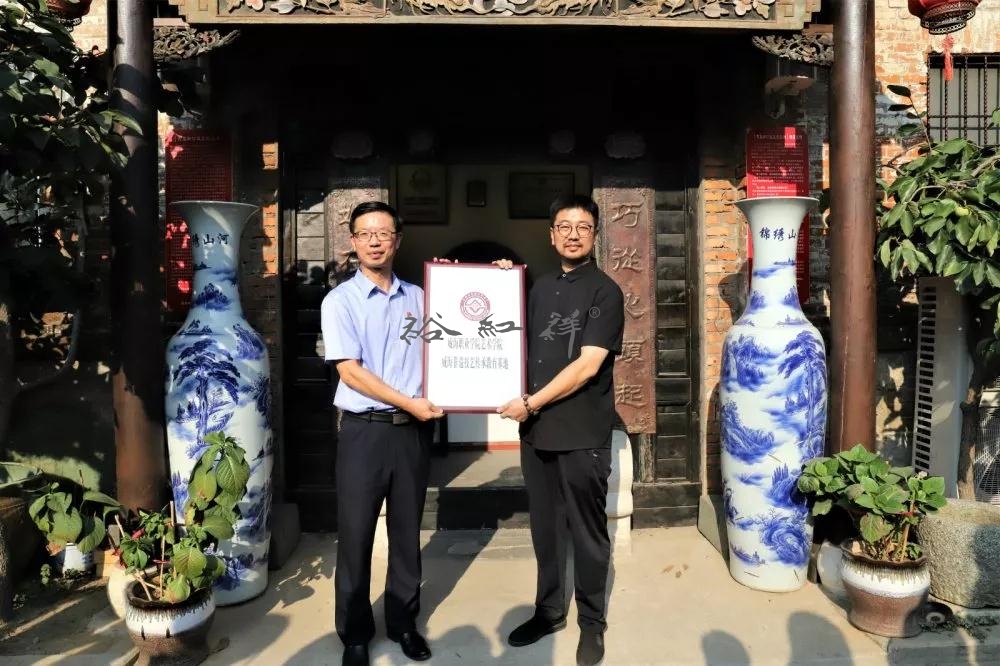 在吉呈轩锔工坊前,艺术学院刘志刚和耿海胜大师共同揭牌,将吉呈轩锔工坊列为艺术学院的非遗文化传承教育基地。