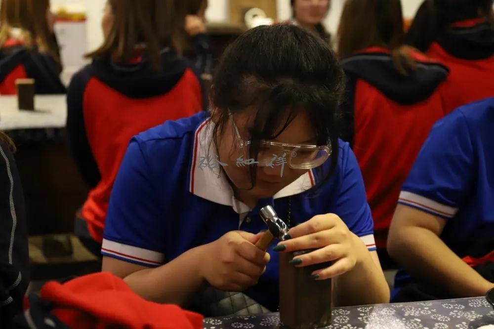 走进吉呈轩锔工坊,随处可以看见过去的“老物件儿”,但凡经过耿大师手的“老物件儿”,都有一种别样的韵味。耿大师如数家珍,向同学们介绍了各种传统锔艺中使用的工具,并鼓励老师和同学亲自尝试,感受锔艺带来的快乐。同学们也通过一段纪录片,更多地了解了锔艺这个行当。大家既兴奋又好奇地看着一件件工艺品,感叹大师技艺之精湛,相约着等回到学校,一起到锔艺非遗社团打造自己的小小作品。
